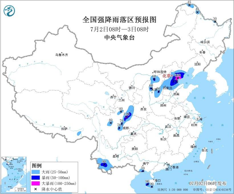 预测,7月2日8时至3日8时,山西中北部、河北中南部和东北部、北京大部、天津、山东北部、四川盆地西北部、甘肃东南部、陕西西南部、云南西南部、广西南部沿海、海南岛西南部、黑龙江西北部等地部分地区有大到暴雨,其中,河北东北部、天津中东部、四川盆地西北部等地局地有大暴雨(100~160毫米)。