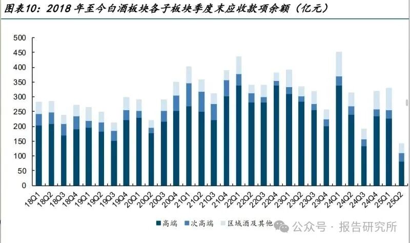 从回款收现的角度看,25Q2 白酒板块所有完毕销售收现 1052 亿元,同比-3.2%,其中五 粮液、古井贡酒、水井坊、金徽酒等 5 家酒企完毕正增长。 相对应地,25Q2 末白酒板块应收款项余额 142 亿元,同比-54.8%;25Q2 末应收款项余额 环比-186 亿元,较 24Q2 末环比-135 亿元幅度有所提高,因此咱们以为 25Q2 销售收现下 滑幅度并不超越也有前期以承兑汇票回款在当期酿成现款流入的成分。 合座而言,在现时表里部环境扰动的配景下,渠谈回款表情更为严慎,即使部分酒企放宽 单据回款策略门槛、边缘对渠谈回款的激发效力也较为一般。回款表情严慎一方面源于渠 谈库存压力,另一方面源于主流白酒单品批价阐发仍然较弱。 近几年自己行业呈现“旺季不旺、淡季更淡”的特征,淡季骨子渠谈出货量有限,本年叠 加外部风险冲击,即使渠谈朝上游酒厂回款较少、到货未几,骨子库存也未有明显去化。 咱们预测后续中秋&国庆旺季将是渠谈齐集去库的窗口期,即齐集出货的同期仍减少回款, 齐集出货预测仍会使得主流白酒单品批价阐发承压,而减少回款预测传导至酒企表不雅营收 延续出清。