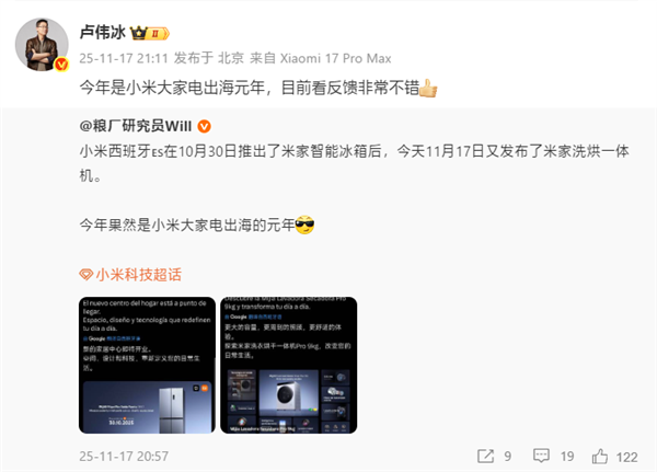 小米集灭亡伴东谈主、总裁卢伟冰发文示意:“本年是小米寰宇电出海元年,当今看响应超越可以”。