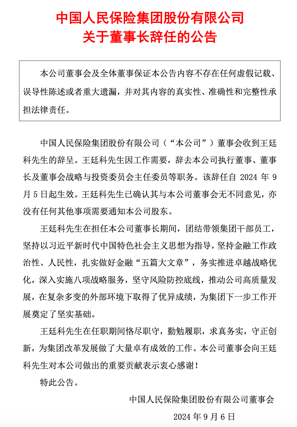 9月6日晚,中国东谈主保公告,公司董事会收到王廷科的辞呈。王廷科因责任需要,辞去本公司施行董事、董事长及董事会策略与投资委员会主任委员等职务。该辞任自2024年9月5日起见效。